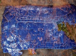 Comme il ne faut rien laisser passer dans cette citerne, nous examinons avec encore plus d’attention les parois. Cette exploration soutenue est récompensée par une découverte assez exceptionnelle (disons le): il s’agit de la gravure d’un navire du XVIIe ou XVIIIe siècle (une date -1693- y est peut être – sûrement (?) – associée). De même des noms à consonances italiennes se trouvent proches du dessin. Il s’agit d’une coque à deux ponts et dunette d’un navire de commerce (probablement) munis de sabords, son gréement, inachevé ou détruit par réfection de l’enduit dans les parties supérieures, est formé de trois arbres à enfléchures, avec sur le beaupré, au départ de sa proue à la poulaine, un mâtereau vertical portant une voile de perroquet. Sur la poupe une grande bandière rectangulaire porte la référence emblématique de la sérénissime: le lion de San Marco.