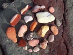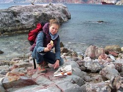 Après une bonne heure de marche, nous arrivons à la pointe, qui abrite plusieurs gros minéraliers au mouillage. L’un d’entre eux est amarré au terminal et charge de la pouzzolane (une visite le lendemain au Musée de la Mine nous confirmera que Milos est un important producteur de minerais en tout genre). L’endroit est désert, étrange. Le vent du nord continue de souffler fort, la mer au vent est blanche et contraste d’autant plus avec la partie sous le vent, zébrée de rafales. Nous marchons longuement sur les plages de galets qui entourent la pointe, découvrant à chaque pas des merveilles : les sacs à dos se remplissent, principalement de cailloux, mais aussi de tout un fatras que la mer rend à la terre, dont les bouteilles !