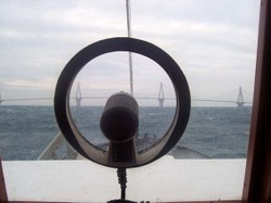 Au petit matin, nouvelle série d’au revoir. Les uns sur le quai (Julien, Marie-Paule, Jean-Philippe) larguent les amarres des autres (Philippe, Cécile, Agathe). Les uns prennent la route vers Athènes, les autres prennent la mer vers Ithaque. Le baromètre s’est accroché aux nuages (1030 hp), le temps reste couvert, le vent nous pousse dans le golfe de Patras. La mer blanchit, écume sous la hargne du courant inverse. Ça s’agite, ça bouillonne sous les hublots du Manguier, qui imperturbable trace son chemin en surfant sur les vagues. Nous passons entre les piles du pont suspendu de Patras – suspendu par des pinces à linges dans le ciel ! -, impressionnant de force et d’élégance puis entre les bacs qui péniblement traversent en crabe.