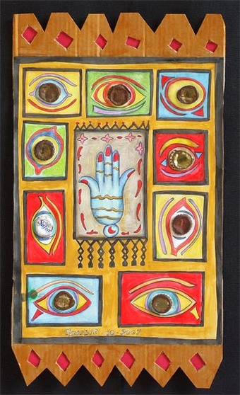 Au centre de chaque panneau, un motif symbolique de la Méditerranée. La main, motif conjuratoire, fréquemment peint sur les coques des bateaux en Tunisie.