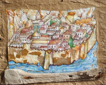 Ce que deviennent nos forteresses…, souvenir d’une ville hors du temps, bâtie à l’abri d’une falaise dont les remparts trempent dans la mer Egée. Vus d’en haut, les sillons de tuiles des toits s’imbriquent comme un vaste tapis, déclinant dans un camaïeux d’ocres des motifs géométriques au rythme aléatoire.