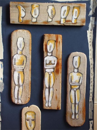 En Grèce, les pêcheurs utilisent de petites cagettes de bois, au format identique, assez épaisses et produites en très grande quantité. Il arrive souvent que le vent les emporte au large, les ballotte longuement dans les vagues et contre les rochers puis les recrache démantelées, polies et arrondies sur les plages, mouchetées de la rouille des agrafes arrachées. Leur texture, nacrée par le sel et les flots s’accorde assez bien avec ces mystérieuses statuettes cycladiques de marbre. Ces idoles sans yeux ni bouche qui semblent pourtant nous observer recueillies dans une muette concentration, imperturbables derrière les vitrines des musées où elles sont maintenant exposées.