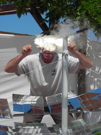 Près de Sagone, du 27 avril au 2 mai dernier, ont eu lieu les Rencontres d’Isula Viva, festival d’art contemporain, colloque et conférences en tous genres (puisque c’est à cette occasion que nous avons pu découvrir le service de santé de la Grande armée Napoléonienne !!!). Nous y étions présents, ainsi que le concentrateur solaire, par un de ces fameux hasards de circonstances qui contribuent au piment de l’existence ! Nous y étions en compagnie d’un jeune artiste japonais, Atsunobu Kohira, dont l’idée était d’utiliser le concentrateur pour chauffer une boule de verre remplie d’huile essentielle d’immortelle pour en exhaler le parfum. Ces deux journées ont été riches de rencontres, et aussi l’occasion de parler pour la première fois en public du CIDER, qui se met en place. Entre autre rencontre absolument incroyable, celle avec François Costa, bonifacien rencontré en 1979 dans une baie du Cap-Vert , retrouvé en 1982 à l’ENV (Ecole nationale de voile) à Quiberon, où il m’avait fait rentré, et dont j’étais resté sans nouvelles depuis !!!