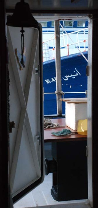 Il y a des images qui évoquent quelque chose d’immédiat et de très précis. Hier soir, en passant devant la porte entrebaillée de la cabine, et voyant l’étrave du chalutier amarré derrière nous, j’ai tout de suite associé l’image à un mot, enfermement …