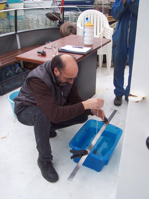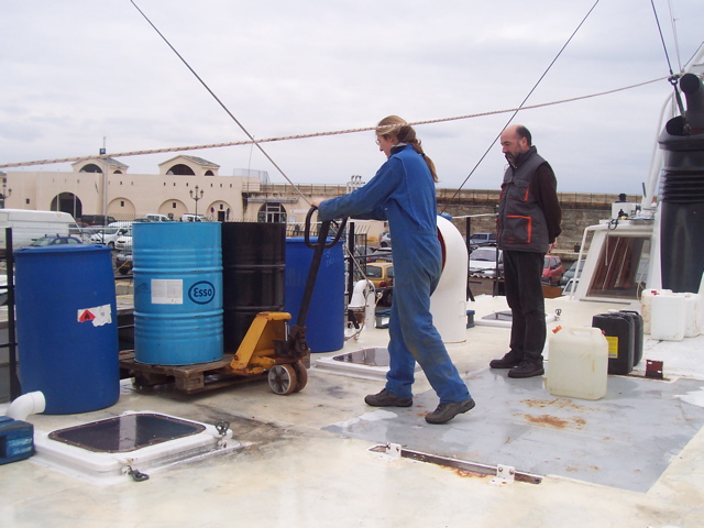 C'est donc lundi soir que Marcel nous a rejoint à Bastia, et mardi matin que nous avons attaqué la manip. Condition météo plutôt favorable, mais quand même pas le grand beau temps qu'on aurait aimé montrer à Marcel… Les essais consistent à déplacer 1500 kgs d'un bord et de l'autre, et de mesurer à chaque fois le déplacement du fil à plomb ! heureusement, nous avions de grands fûts de 200 l, remplis d'eau, qui ont permis de déplacer plus facilement cette masse. Judith s'est transformée pour l'occasion en MHQ (manutentionnaire hautement qualifiée). Le Manguier a difficilement gîté, mais suffisament pour que Marcel puisse dérterminer avec précisions la section des bipodes. Un très grand merci à Marcel qui s'en est reparti dés l'après midi pour Sète, où l'attendait quelque autre audit …