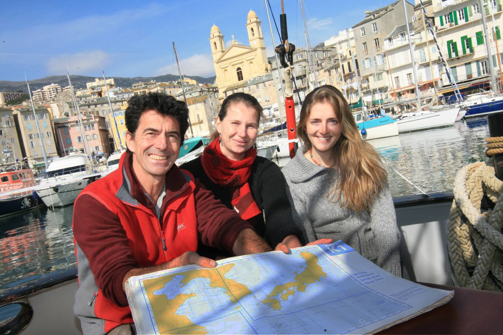 La Corse aussi a fini par découvrir qu'un petit bateau rouge mouillé dans le Vieux Port de Bastia allait partir pour une grande aventure: les portes s'ouvrent, et les contacts se multiplient. Pas seulement les contacts d'ailleurs, les aides et les soutiens aussi. Témoin ce clin d'oeil au Japon, fixé par Louis Vignarola, photographe au Corse matin, venu rédiger un article de présentation de l'expédition.