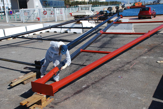 Difficile de tout faire coïncider: l'équipe des soudeurs, le grutier, la télé, et la météo … tout semblait réuni pour que cela puisse se faire ce matin ! Réveil très matinal (5h30) pour avoir le temps d'appareiller du Vieux Port jusqu'au port de commerce et préparer le chantier. Mais Eole et Poséidon en ont décidé autrement: un petit SE soufflait déjà au réveil, accompagné d'un petit ressac, oh, pas bien méchant, mais suffisant pour contrarier la mise en place des bipodes … On attendra donc lundi matin, le grutier ne travaillant pas le samedi matin (ben oui, ça peut se comprendre, non !). Une petite image des bipodes à terre, histoire de vous faire patienter !