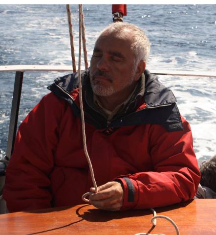 Qu’il soit en train d’affaler une voile, de regarder l’horizon ou de boire du vin rouge, Philippe Rigaud, notre écrivain de bord a toujours la même position.
