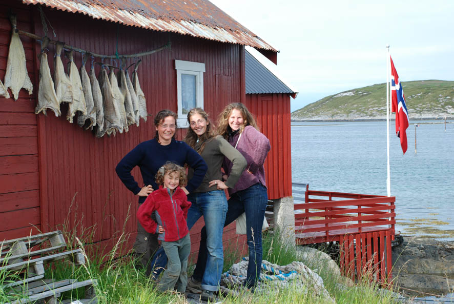Les « Morues du carré » posent devant un banc de morues séchées sur l’île de Gjeslingen Sör