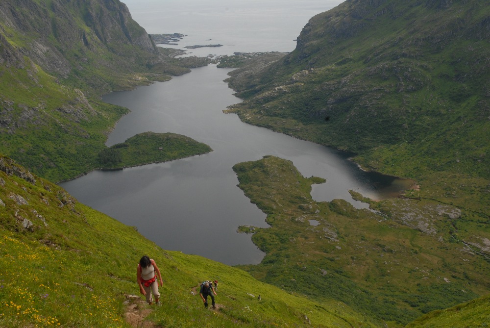 Après avoir longé un lac dont les eaux limpides sont attirantes , nous grimpons à la norvégienne c'est-à-dire à la verticale ( pas de lacets dans ce pays sauf sur les bottes en caoutchouc) jusqu’à un col qui nous offre une superbe vue sur un autre lac et la mer. A la descente nous goûtons la douceur et le moelleux des mousses qui recouvrent le sol, incitation irrésistible à la sieste confortable que rien ne trouble – pas d’insectes dans ce pays