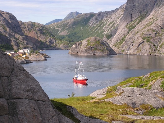 Les Lofoten s’éloignent, les Vestraalens autre archipel au nord se profilent . Enfin le climat attendu : brume, froid, et un peu de crachin et on peut enfin sortir notre garde de robe norvégienne. Ces îlessont plus austères , est-ce dû au temps , bien que moins montagneuses et plus cultivées sur les rivages. Nous y verrons nos premiers animaux sur pattes : vaches,moutons et chèvres. Quelques ballades à terre, une le long de la cote comme mise en jambes et une à la recherche des lacs . Les bistrots se font de plus en plus rares.