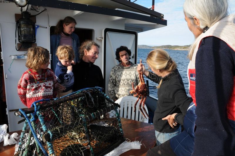 Nos premiers crabes géants sont offerts par PC, pêcheur norvégien de Kirkenes. Les autres, plus petits, sont entrés dans notre casier au mouillage. « Récolte » garantie à chaque remontée de casier ! On imagine que les fonds en sont couverts !