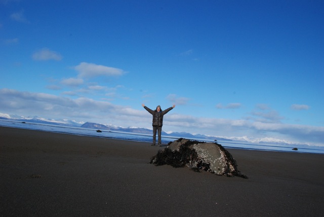 presqu’île d’Alaska en arrière plan. Je marche un peu sur la plage, laissant
