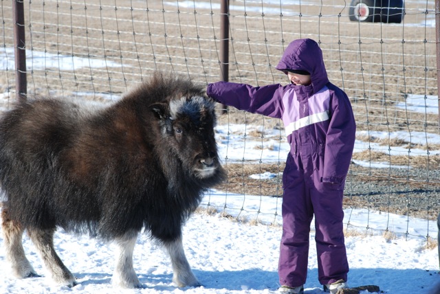 Deux escapades aussi belles l’une que l’autre : profitant d’une matinée ensoleillée – bien que little bit chilly -, nous nous sommes rendus dans la ferme de Perrin, dont le grand-père avait voulu essayer de voir s’il était possible de domestiquer des bœufs musqués. Ces animaux assez extraordinaires supportent les températures les plus extrêmes grâce à leur laine particulièrement chaude, le qiviut. Au printemps, ils muent en quelque sorte, et cette laine est récupérée pour en faire essentiellement des bonnets ou des écharpes.