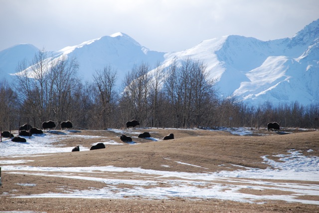 Les bœufs musqués ont été, comme beaucoup d’autres animaux, traqués par l’homme, et ils ont failli disparaître à tout jamais. Ils protègent leurs petits en formant un cercle autour d’eux, et tournent autour, ce qui en fait une proie facile pour les chasseurs … Il en reste encore quelques uns en Alaska, sur la côte nord du Canada, au Groenland, et quelques uns réintroduits dans la péninsule de Tamyr en Sibérie. C’est un animal magnifique, et nous avons pu nous en approcher de très près, surtout des petits …