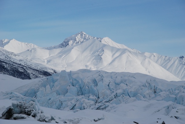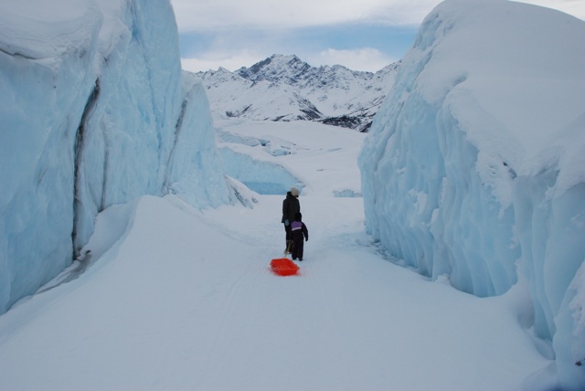 Le lendemain, nous avons mis le cap au nord, pour aller voir le glacier de Matanuska. Le propriétaire du lieu –car il faut s’acquitter d’un droit d’entrée – nous a vivement conseillé de ne pas nous écarter des traces faites par sa motoneige, les crevasses étant masquées par la neige tombée en abondance ces derniers jours. Randonnée de presque 3 heures au milieu de ces pyramides de glace bleue, partie de luge avec Agathe, silence absolu entrecoupé des rires de la puce ! des moments de bonheur !