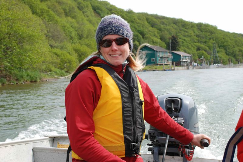 Quand nous arrivons ce matin au Weir, Dawn, une blonde mutine que Phil a rencontrée à Kodiak, est enfermée dans un fruste local qui sert à la fois de laboratoire, de remise à provisions et de salle de ping-pong. Elle pêche un minuscule fretin argenté au fond d'un seau, avec une épuisette grande comme la paume de la main. Ceux de 2 cm ont 1 an, ceux de 7 cm dans les 3 ans… enfin, c'est ce qu'elle va vérifier, avec son co-équipier ès-alevins. Ils leur prélèvent des écailles, qu'ils examinent au microscope. Parmi les stries concentriques, certaines, plus accidentées, indiquent le changement d'année.