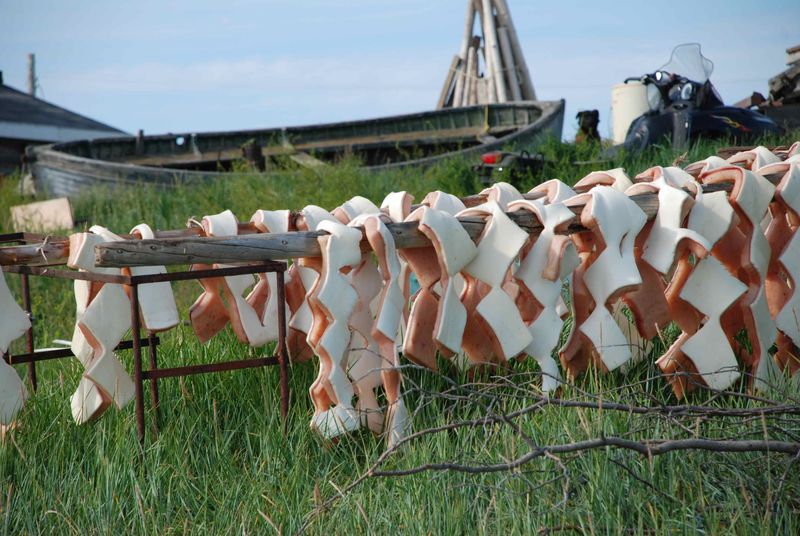 C'est beau, et c'est bon. C'est le fameux "muktuk" de belouga, la baleine blanche assez chassée par ici pour avoir des réserves pour l'hiver. Nathalie suggère qu'on le mange avec de la tapenade … on va essayer !