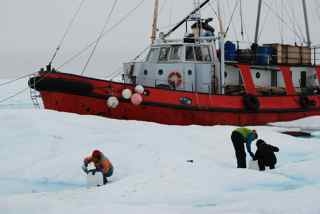 Le temps d'avaler la purée et nous entamons sans tarder la ronde des bidons, à l'aide de diverses casseroles et entonnoirs sous l'œil vigilant du capitaine qui scrute les alentours. S'agirait pas de rater la venue d'un ours blanc en quête de socialisation ! La chienne profite elle aussi de l'escale pour se dégourdir les pattes et batifoler dans l'eau glacée. Les plaques dérivant, il faut également prendre garde à ne pas se laisser enserrer par les blocs. Aussi, les bidons remplis, nous dégageons nos amarres et reprenons la route en direction du cap Pary et de l'île Booth.