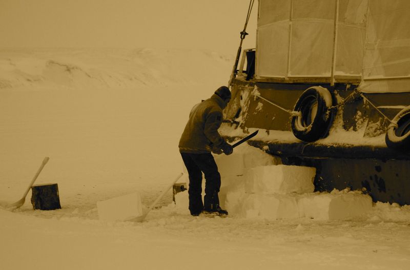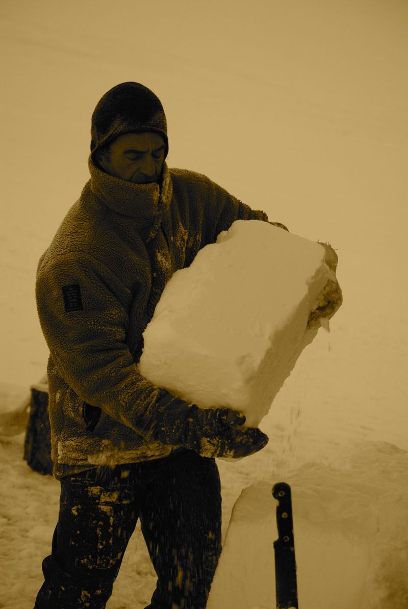 Enfin le début de la construction du mur de neige, grâce aux récentes chutes qui ont formé des congères tout autour du bateau (mais pas contre la coque, c'est amusant !). Comme il fait froid, la neige est absolument sèche, et je découvre à quel point les blocs de neige compactés peuvent être faciles à travailler. On dirait du siporex, en plus facile à découper.