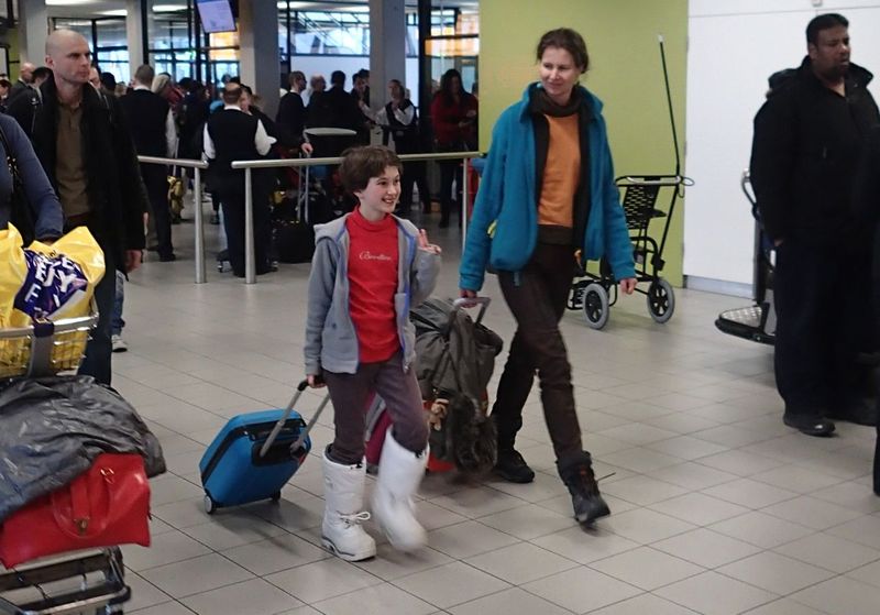 C’est le classique embouteillage du lundi matin … et dire qu’il y a des gens pour se le farcir toute une vie … dernière interrogation sur l’absurdité de nos sociétés modernes avant notre envol vers le Grand Nord ? C’est Romain, le frère de Cécile, qui nous mène à l’aéroport. Un peu plus de 100 kgs de bagages à tous les trois, c’est quand même sympa d’avoir un chauffeur pour se faire accompagner ! Merci Romain !