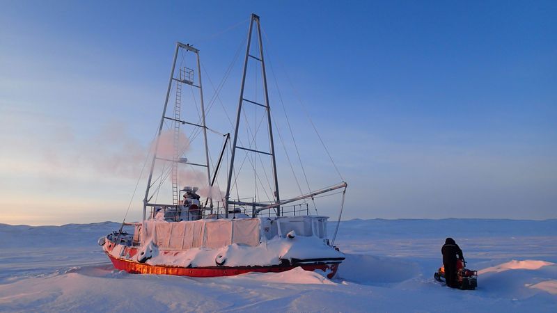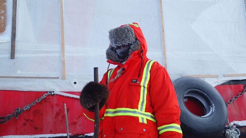 Meanwhile, there is some tight schedule: Restart the generator and stimulate Dickie, the big diesel stove for those who’d have forgotten. With a smart idea (the 12V battery from the generator is set to load with a battery charger powered by the 220V converter, fed himself by 24V batteries on board! Hope you all followed!) and a good night charging, the battery is doing the job and boots the generator without too many problems. And now the light is back in the ‘wardroom’. It is going as well as for the stove. The fuel doesn’t flow, and yet it is not frozen in the can. Too narrow external supply pipes are probably frozen. Philippe comes with ingenious systems and eventually succeed to start Dickie! Fair enough! Saturday was recorded -35°C / -31°F outside. It’s tingling the nose end…