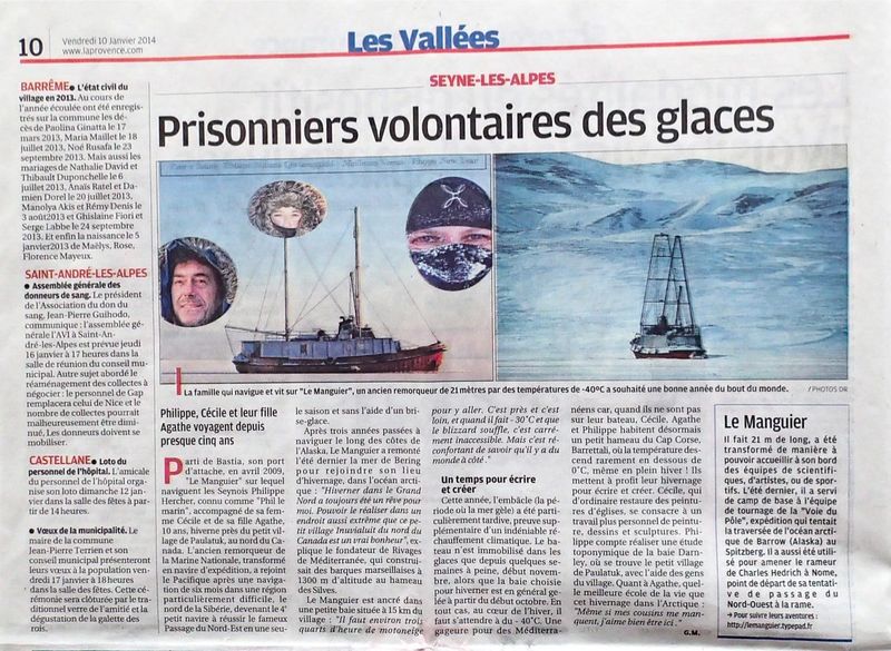 Here are some scans from a regional French newspaper (« La Provence », January 10th, 2014) with an article about us as « Voluntary ice prisoners » (2nd scan), establishing some connection between the southern French alps and Canadian far North and detailing a bit what we do in Paulatuk and Argo Bay.