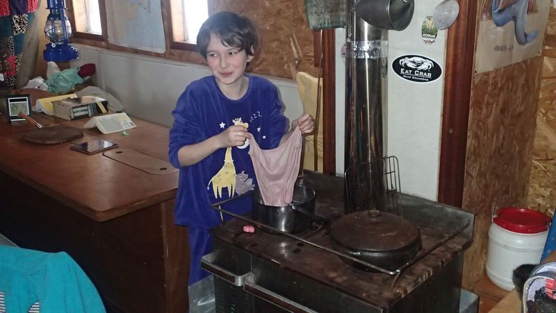 And no we're not dead! Just a bit buried in the snow! Actually, more like dust of snow as the blizzard is just that: a kind of highly scouring white powder that prevents you from seeing and breathing … In these cases, of course, the only thing to do: stay well comfy inside. It felt good inside indeed, so good that our "little excited" (stove) heated strong, so strong … he finally set fire to the OSB wall, yet protected by a kinda sheet of asbestos! The fire (which was actually a slow and small-scale combustion, let's quickly reassure parents and relatives…) quickly circumscribed, we moved the stove closer to the inside of the room. It heats least the wall, and more the wardroom!