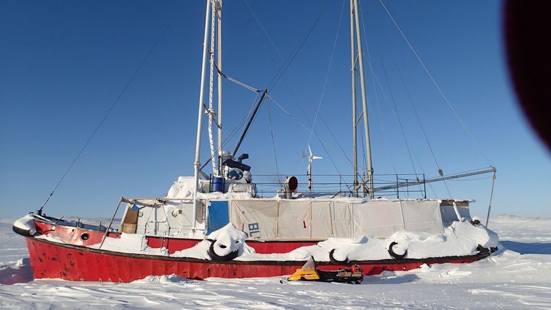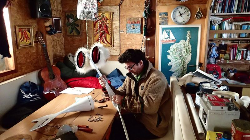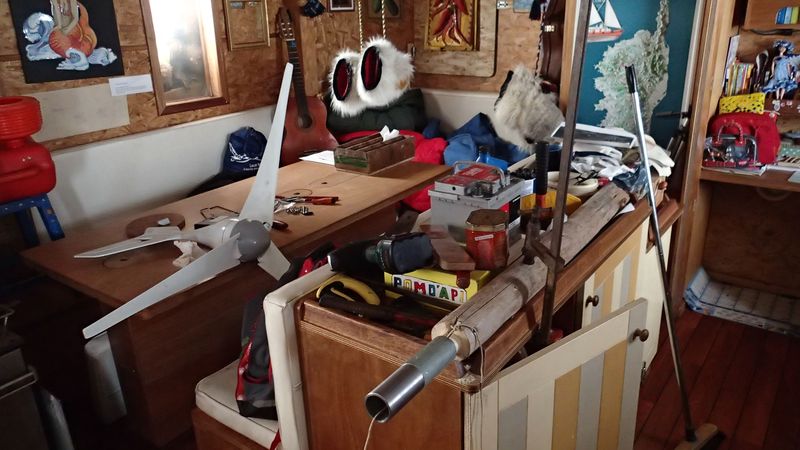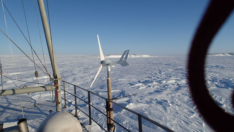 Seul problème, mais qui n'a rien à voir avec l'éolienne: nos batteries ont froid, très froid. -15°C dans la salle machine … En jetant un oeil sur le niveau de l'électrolyte, je me suis rendu compte qu'une mince pellicule de glace en couvre la surface … Et là, je m'adresse aux lecteurs du blog spécialistes en batteries: que faut il faire ? Car les batteries se déchargent presqu'aussi vite qu'elles ne se chargent, ce qui veut dire que quand Eole est au rendez vous, on a de l'électricité à bord, et que 6 heures après, on a plus assez de jus pour faire tourner le convertisseur 220V. J'ai pensé ajouter de l'antigel, mais est ce bien raisonnable ?