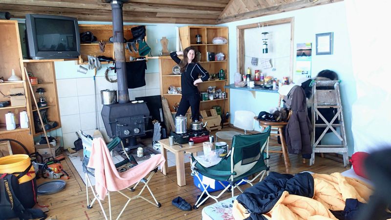Throughout our stay, we're going from one surprise to another, discovering an amount of random objects, dropped into this house so hard to reach in the middle of the arctic desert. A huge upholstered armchair, with floral prints, small wheels, chairs and table in solid wood, varnished and fretted, sofa bed, mini blind mounted on each window, chandelier, fan, mirrors, dressers, widescreen TV, besides all the electrical equipment left to its inner emptiness due to the lack of electricity (which used to be provided by the fueled generator).