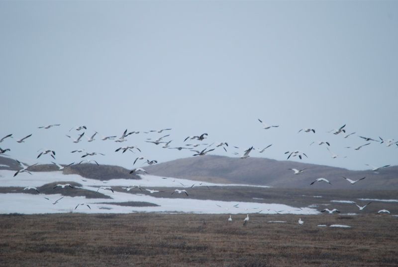 The return of geese, also means a increased snowmobiles traffic, that can be described as intense for the Arctic! It's the departure to the camps, and many Eskimos will settle in Fred Mathews, just behind Argo Bay, where there are lots of good fish and a faire number of good Geese! And last but not least, geese equals light. For several weeks now, even if the sun still sets, the dark night went away: there's light 24/7…