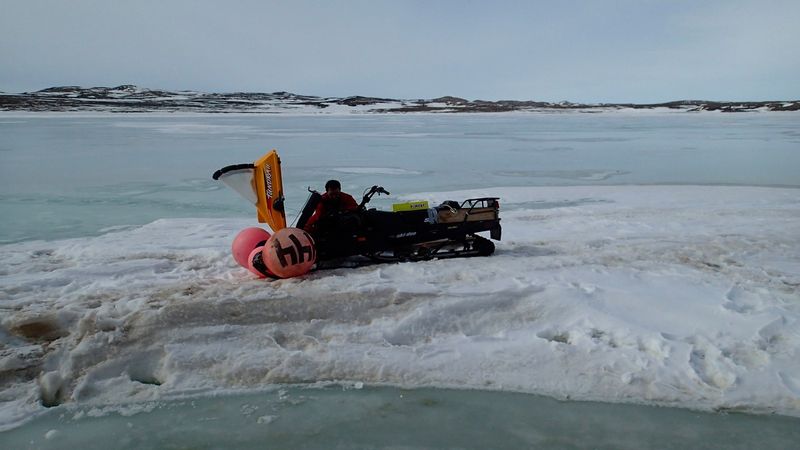 Le gros nid rembourré du Manguier s'est transformé en un véritable petit lac et le bateau toujours scellé dans la glace a repris sa fonction d'île. Craignant cette rapide montée des eaux, il a fallu déménager la motoneige en vitesse et franchir une zone de banquise noyée sous 40 cm d'eau.