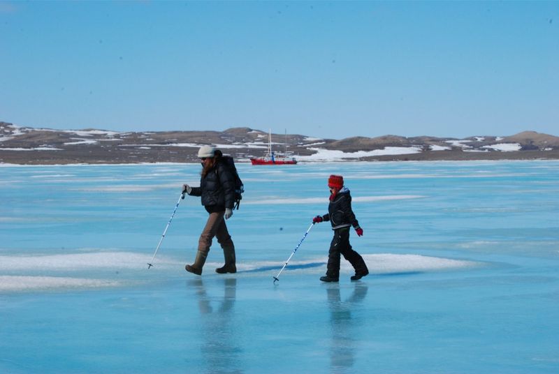 Au loin, sur la banquise, des phoques et leurs petits sont sortis de leur trou pour prendre les rayons de soleil que ce matin nous apporte …