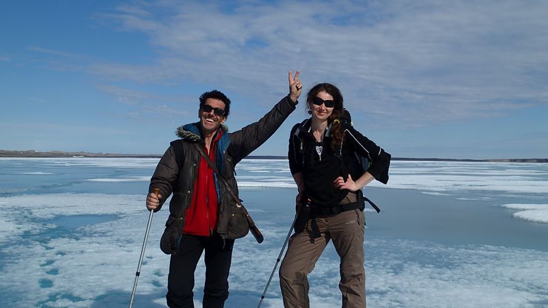 Nécessité oblige! ça s'appelle "Extension de permis de séjour". Agathe et moi devons renouveler notre demande de permis de séjour au Canada avant la date fatidique du 20 juin. Impossible de faire cette demande à partir de la connexion satellite du bateau malgré les échanges plus que cordiaux que nous entretenons avec l'officier de l'immigration d'Inuvik! Il nous faut donc envisager une virée au village. Par ailleurs, la banquise devient chaque jour un peu plus hors d'usage. L'eau de fonte a fini par s'écouler de la surface, supprimant les mares à la profondeur traitreuse, mais les fissures s'agrandissent et l'accès à la côte est de plus en plus réduit. Impossible d'imaginer partir en motoneige. Il n'y a plus qu'une solution, celle qui orne nos extrémités en contact avec le sol!