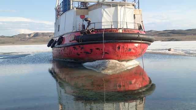 On se sépare, et nous les accompagnons du regard un bon moment avant de nous remettre en route. Une toute petite heure de marche et nous voilà devant le bateau. Avec deux facteurs à prendre en compte: la marée est haute, la glace a sacrément fondu. On cherche, on cherche. Pas facile de trouver un passage. C'est même impossible !
