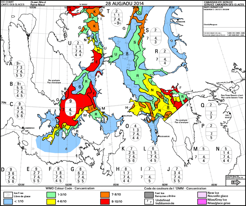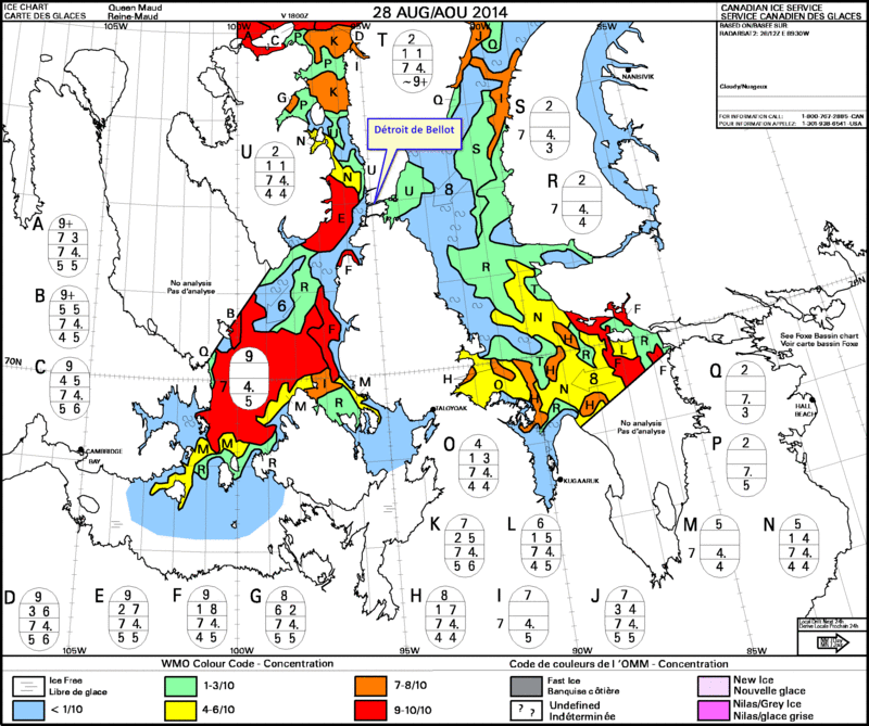 Philippe a essayé la remontée de Peel Sound devant l'obstruction à l'ouest du détroit de Bellot et les vents d'est risquant d'amasser la glace à l'entrée est de ce même détroit. Il est arrivé jusqu'à la pointe nord ouest de Somerset Island à 74°06' N 95°54' O (point rouge sur la carte noir & blanc) mais il s'est heurté à une langue de glace épaisse et compacte qu'il n'a pas pu franchir. Il redescend donc vers le détroit de Bellot en espérant que la situation ne va pas s'y dégrader.