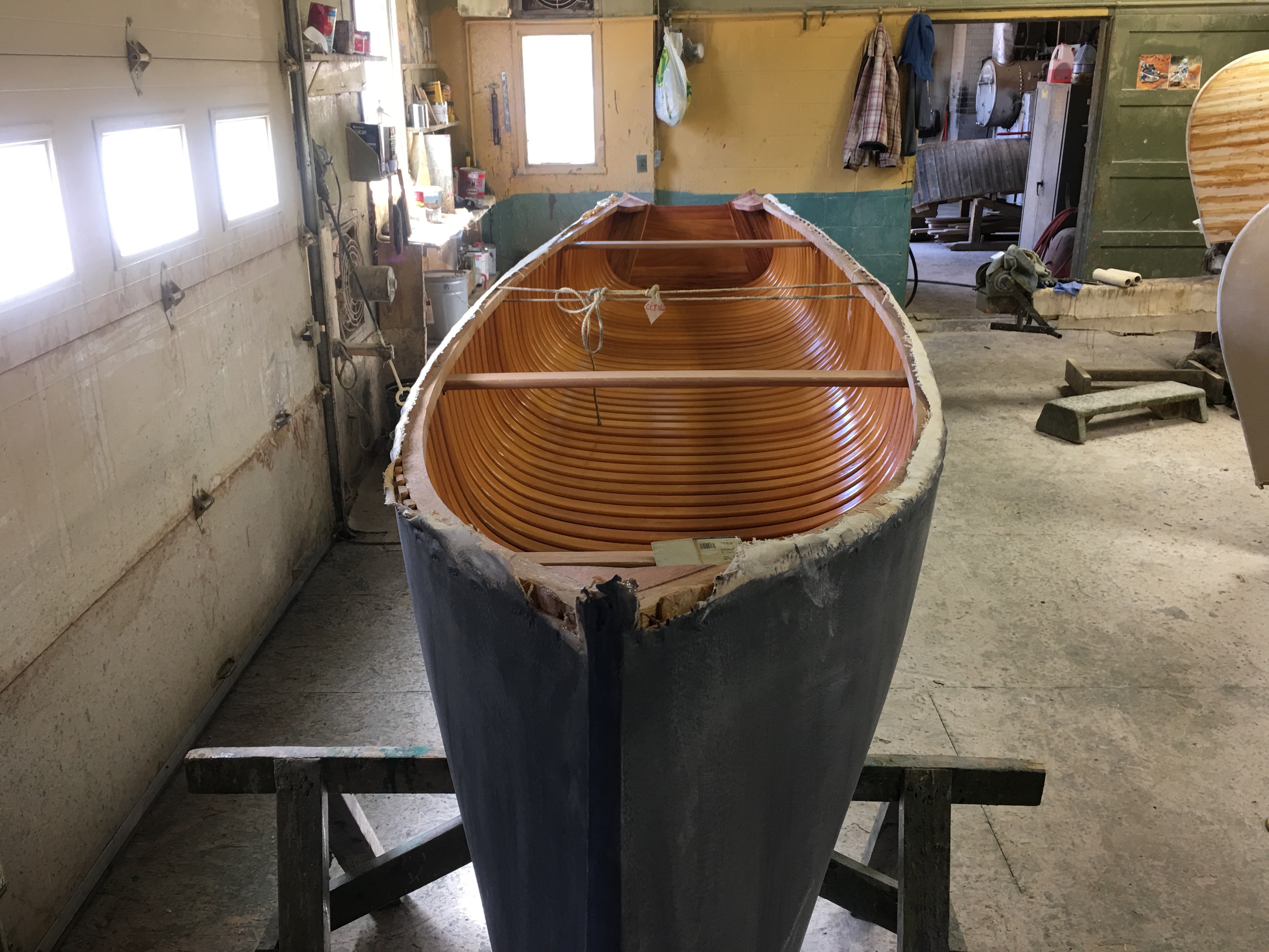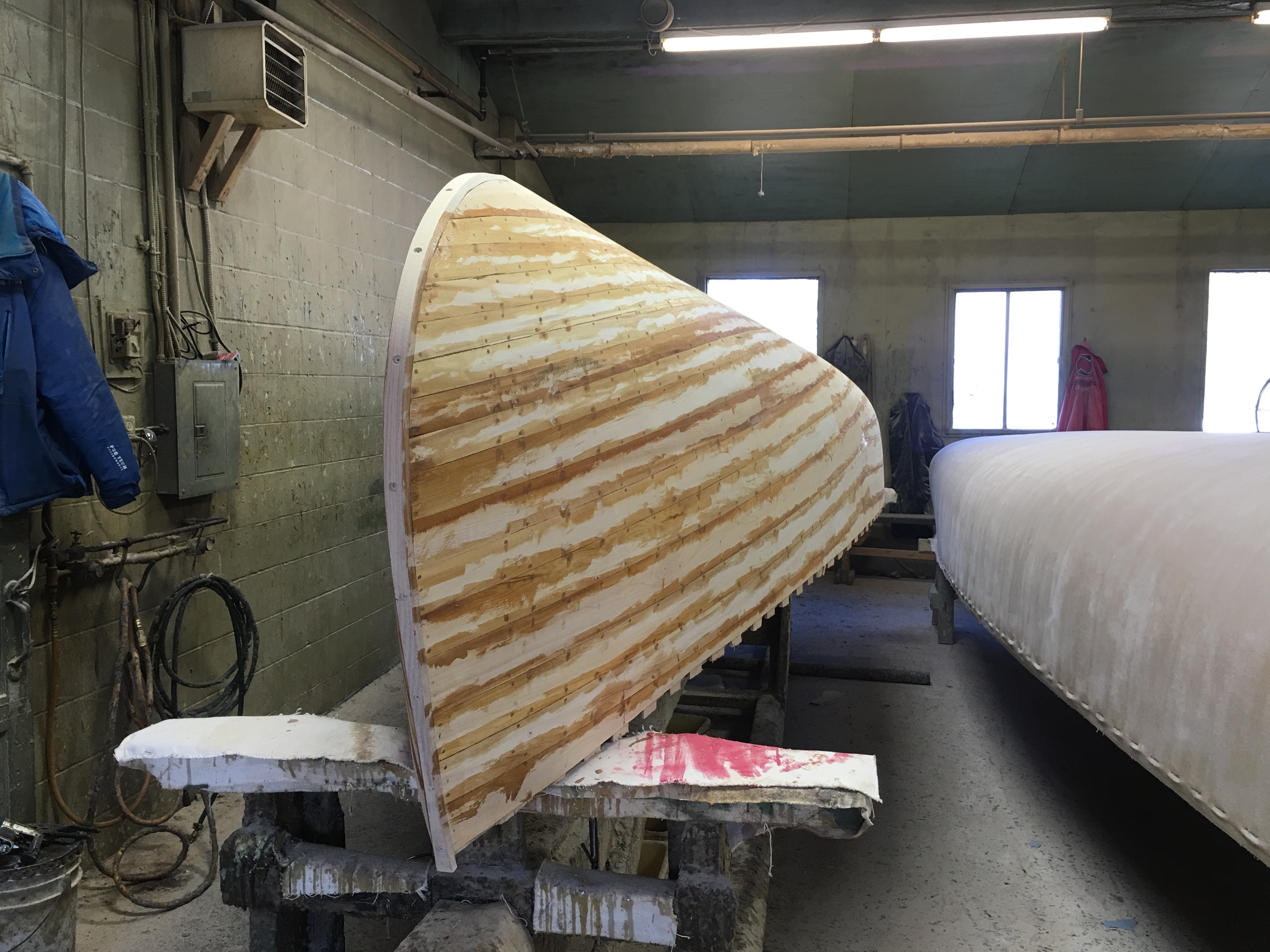 Nous voilà enfin au chantier NorWest. Karl, l’un des associés, nous accueille chaleureusement et nous fait visiter les différents ateliers qui constituent le chantier. Je suis émerveillé par la qualité du travail, le degré de finition, et la beauté de l’ensemble. Un travail qui mérite d’être connu au-delà des frontières pour les amateurs de beaux canots. Bordés et membrures en cèdre rouge, canvas collé à l’époxi en extérieur.
