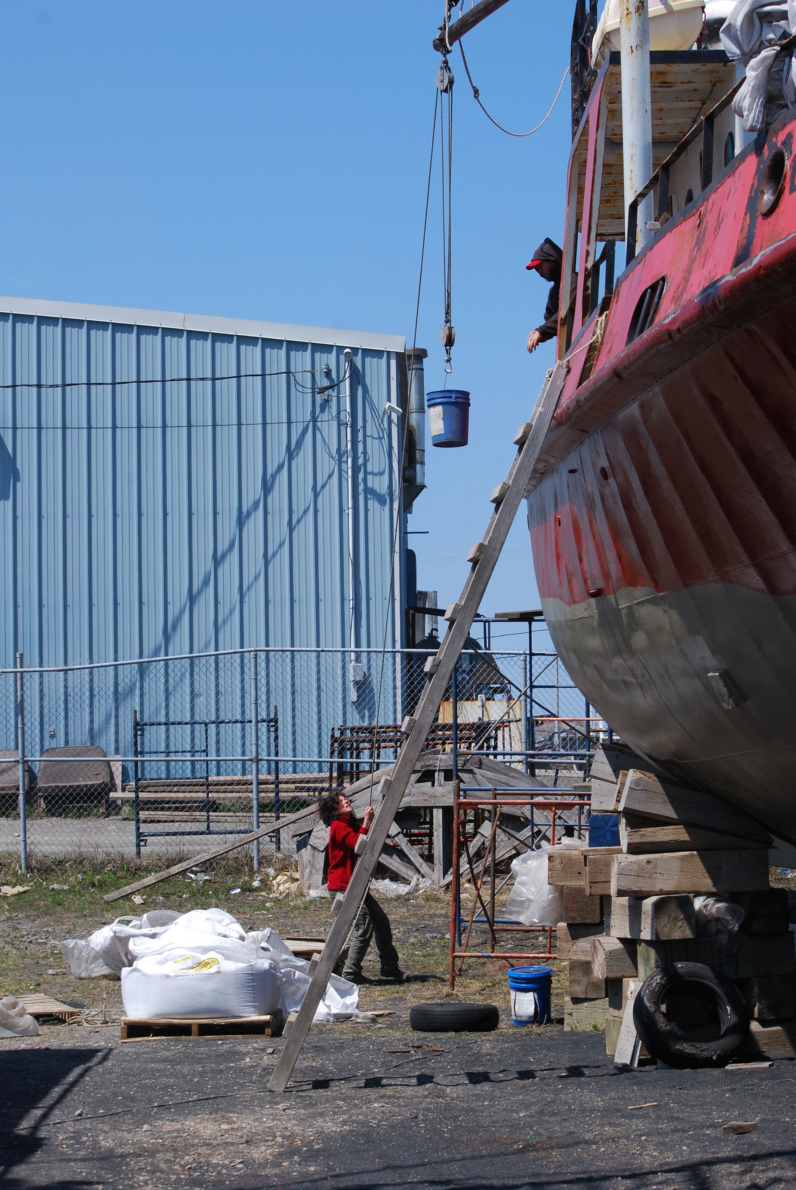 Le sablage est presque fini. Il nous aura fallu 8 poches de sable de 1500 kgs chacune, soit 12 tonnes de sable … 12 tonnes à passer des poches de sable dans des petits sauts de 20 litres, puis à verser dans la sableuse. Et, quand il faut sabler le pont, à monter … Pectoraux et biceps gonflent à vue d’oeil, inutile d’aller faire de la gym en salle …