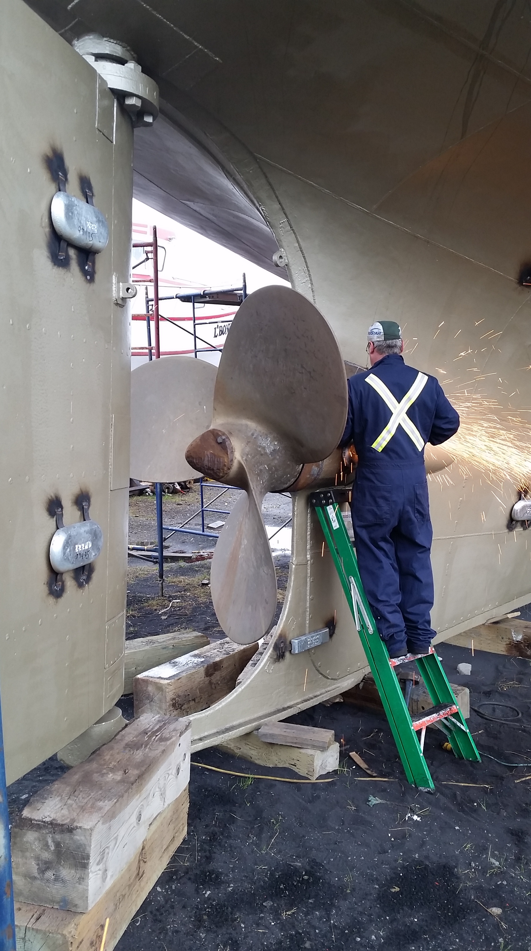Lundi pluie, comme annoncée, mais pas suffisamment pour nous laisser inactif. On bosse à l’intérieur, pendant que Serge, le soudeur du chantier Bouchard, fait des prouesses à la baguette (de soudure): les trous sont bouchés, les renforts posés, et mardi soir (à l’heure où je vous écris), le Manguier devrait être étanche …