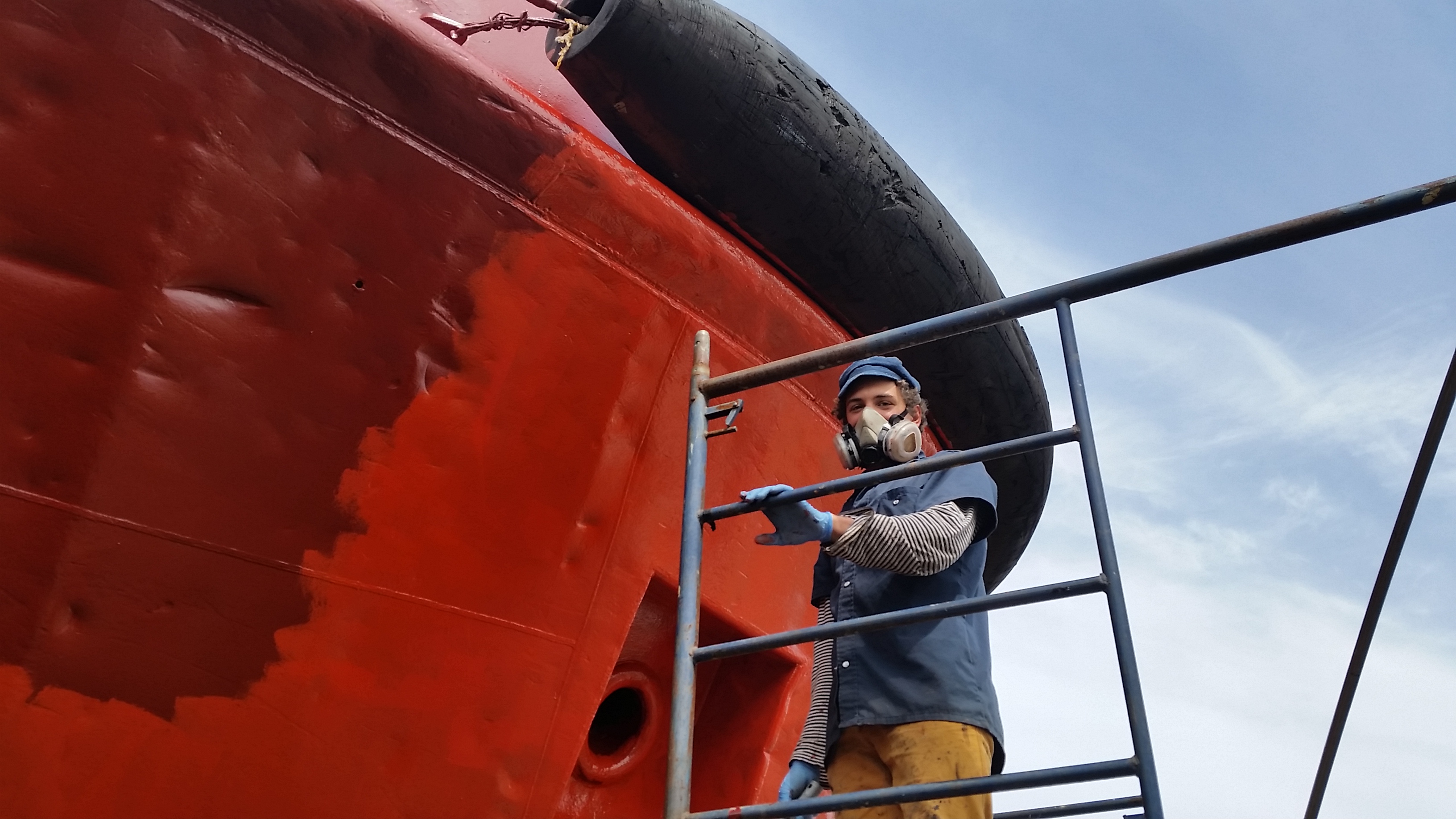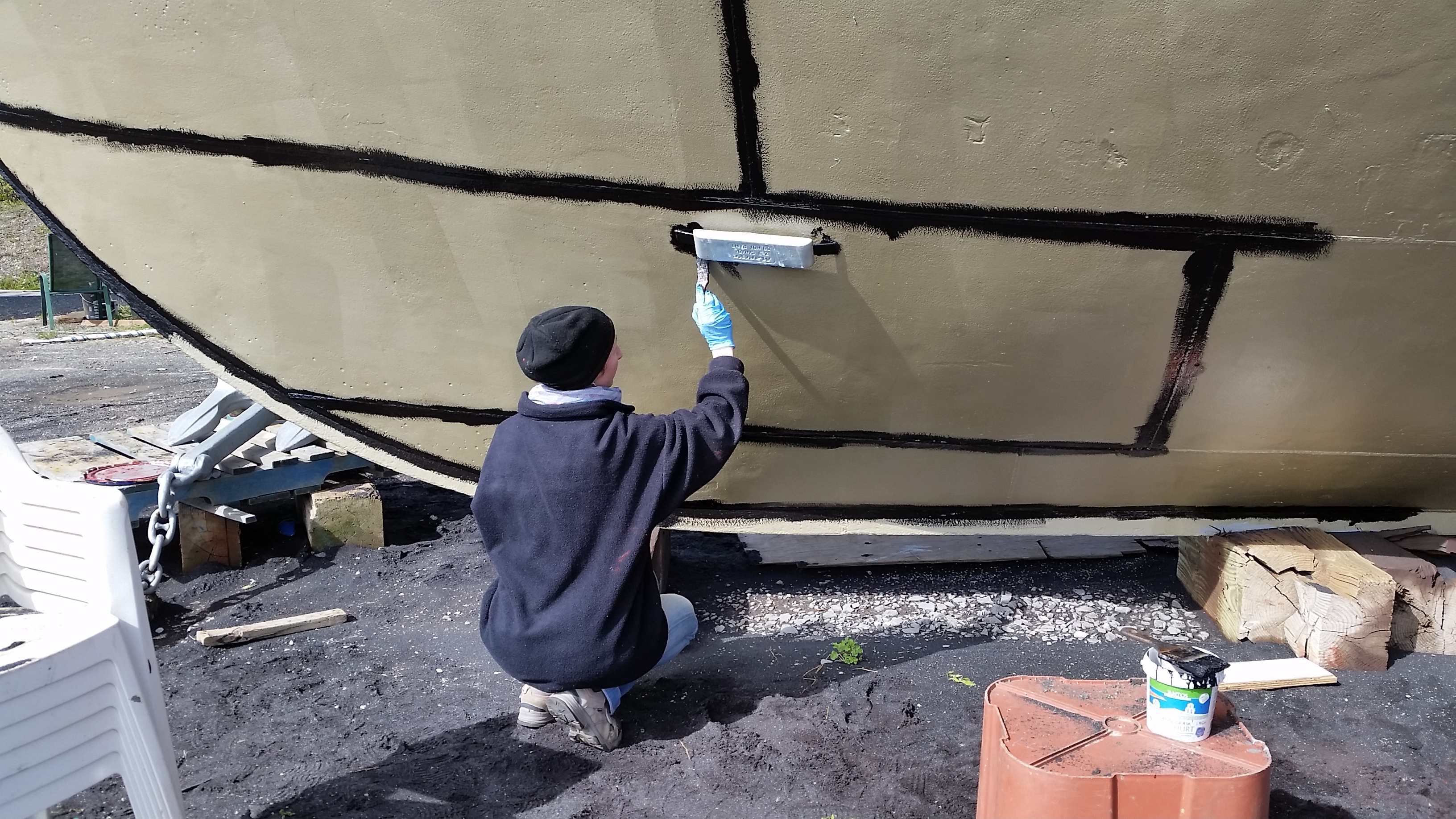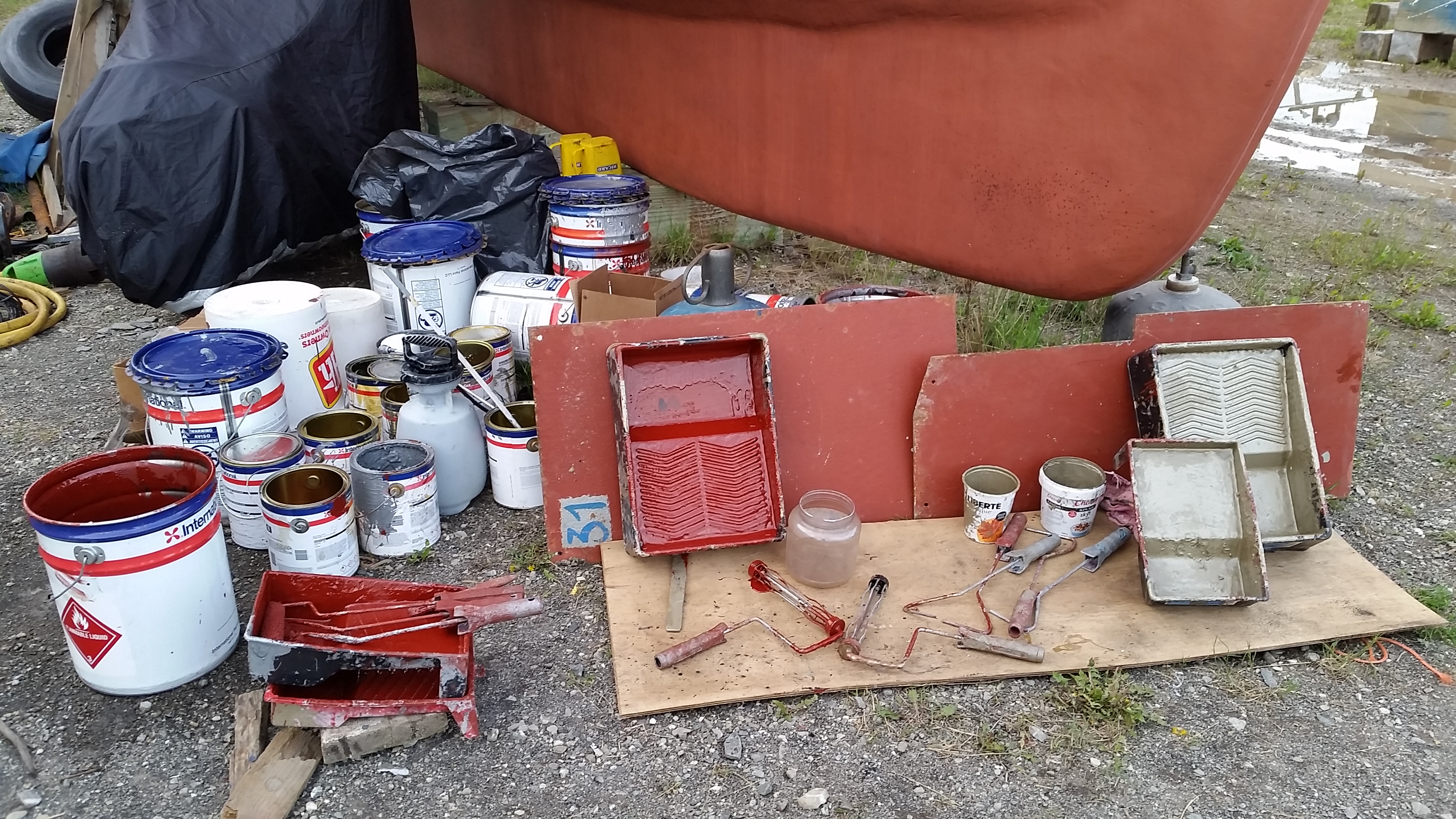 Les conditions météo qui sont devenues mauvaises en ce mois de juin (alors que, par chance, le mois de mai fut vraiment beau) nous obligent à travailler de façon très soutenu certains jours, ce qui est bien sûr un peu stressant. Vendredi matin au chant du coq (ou presque …), deuxième et dernière couche de bronze sur les oeuvres vives. Le temps d’un rapide casse-croûte, nous attaquons une troisième couche d’époxi rouge sur la coque, car l’idée est de peindre la peinture finale le lendemain. Une deuxième couche d’époxi rouge est aussi passée dans les coursives, pendant que Keven démonte la vitre arrière de la timonerie, à moitié décollée. C’est aussi vendredi matin que Vincent nous quitte, après avoir passé trois semaines à bord. Il part pour un autre chantier de peinture, mais là, il s’agit d’un appart … l’art de varier les plaisirs ! Merci pour ce long séjour, Vince !