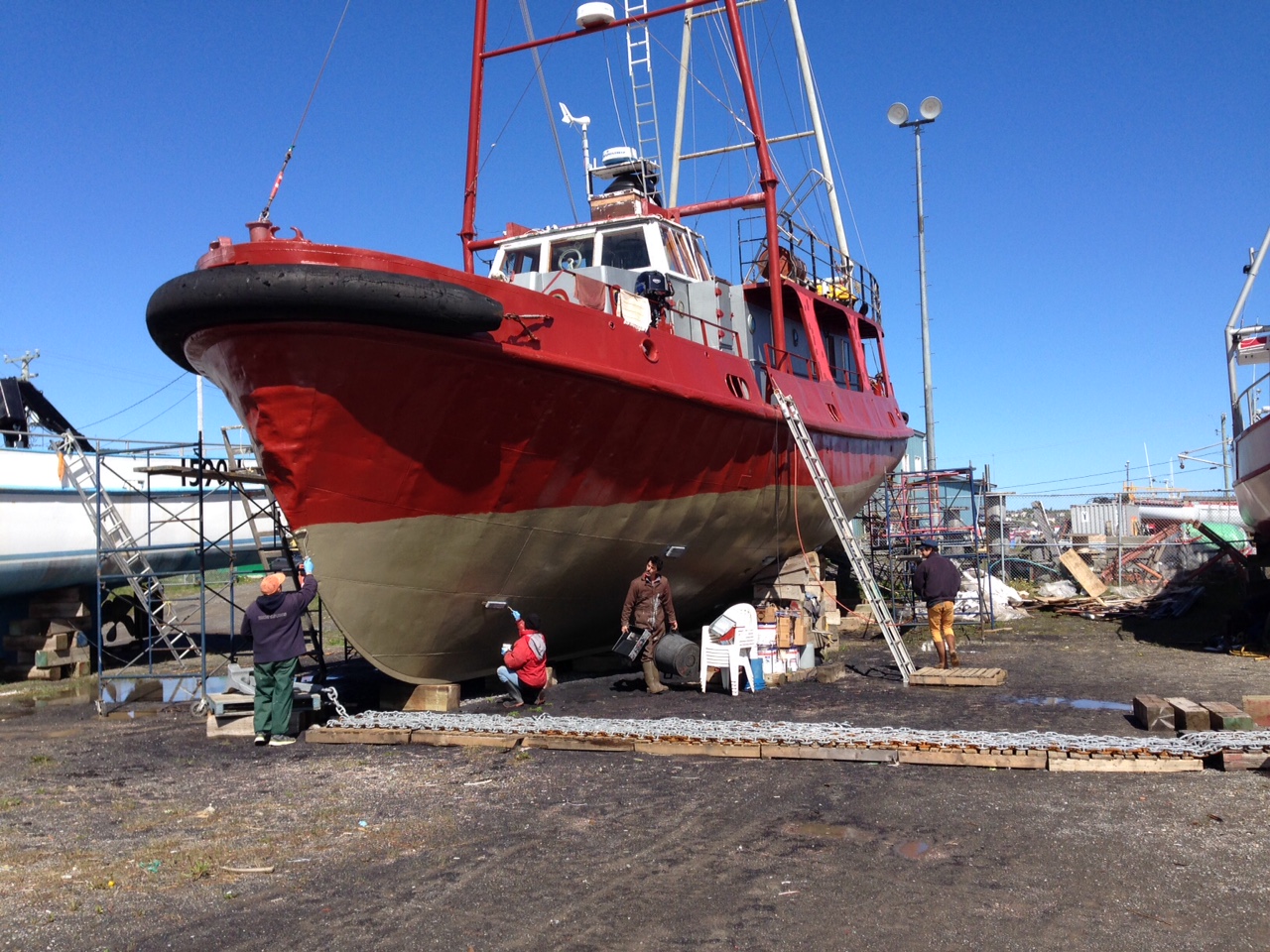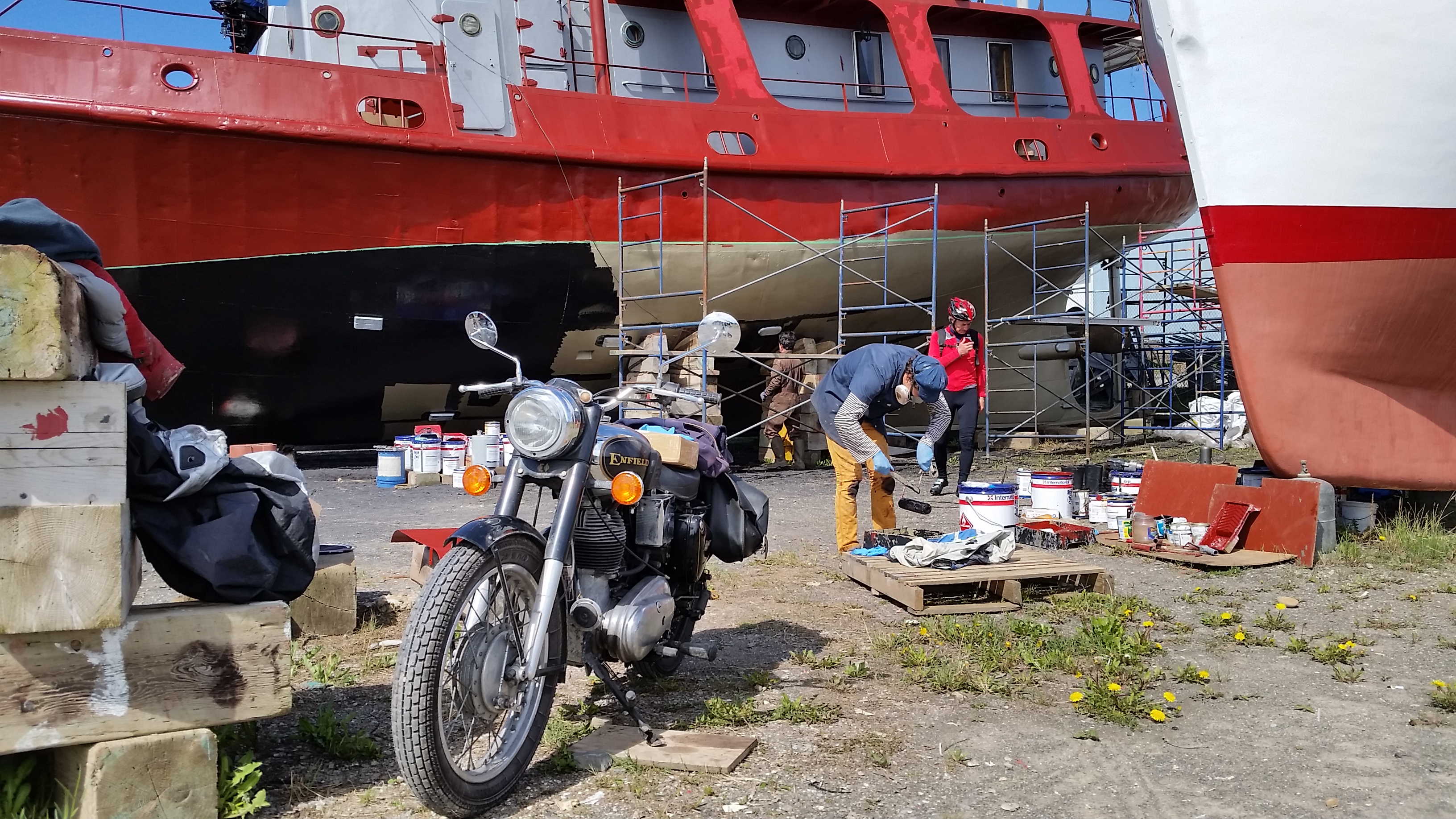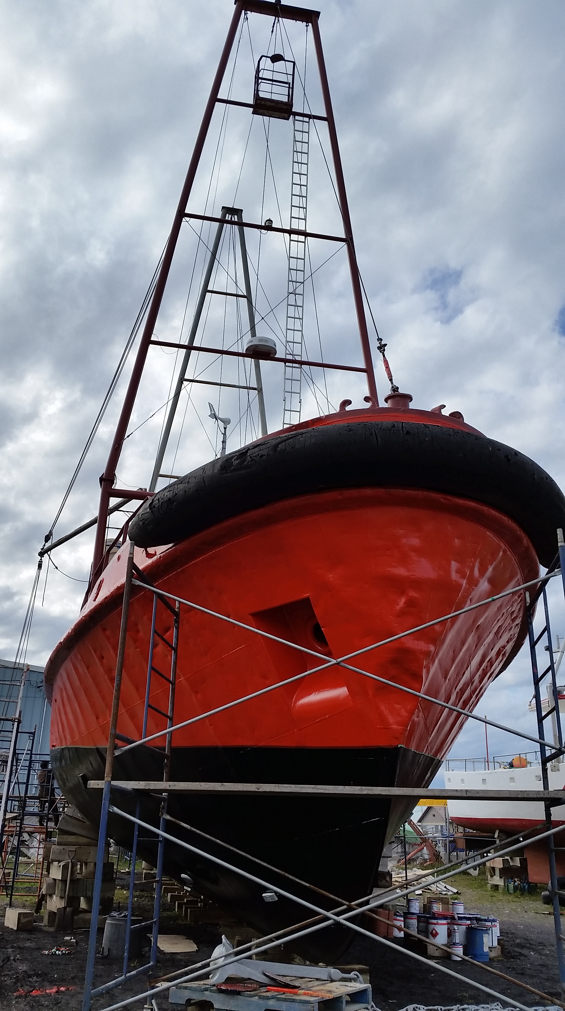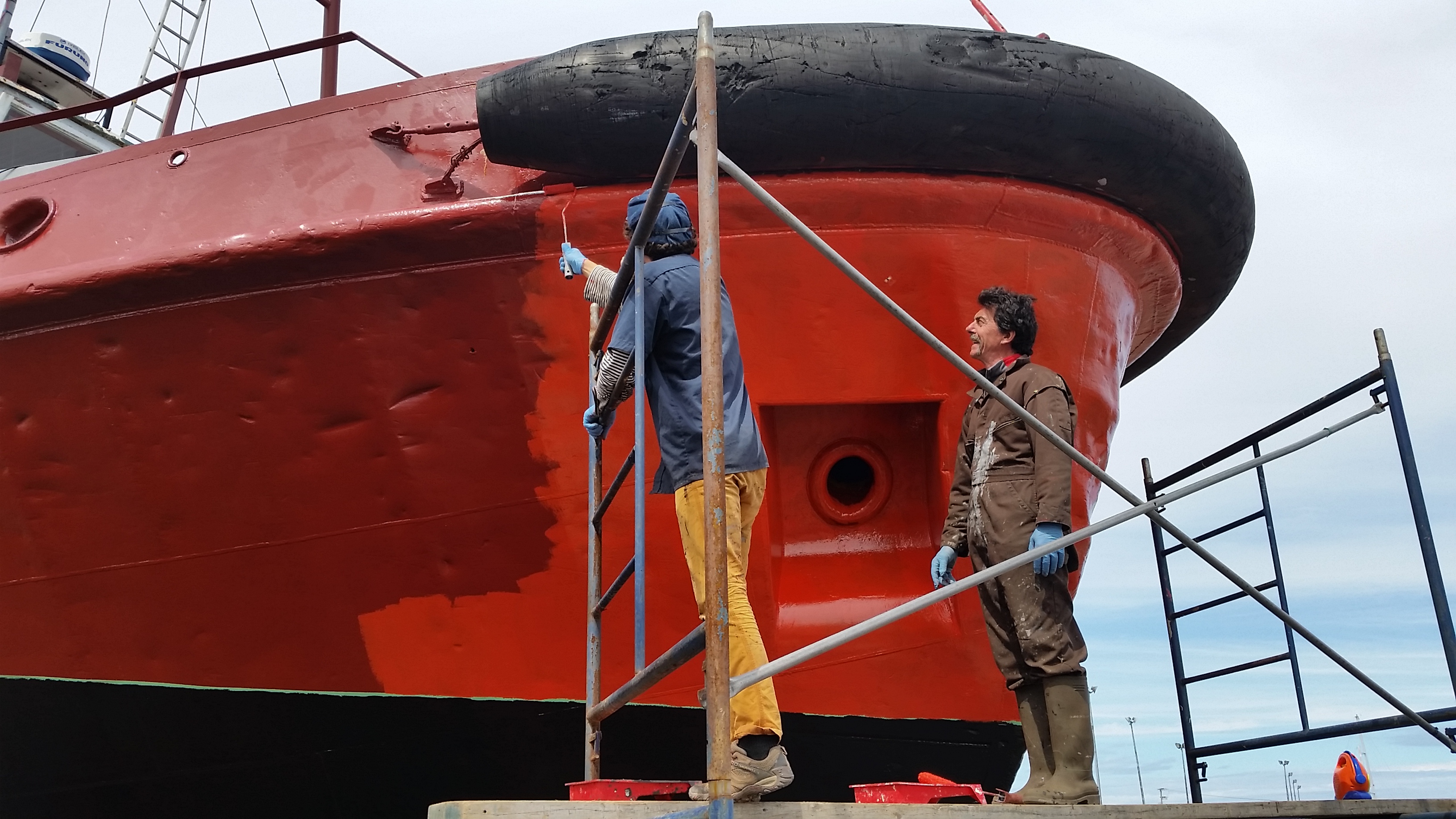 Les conditions météo qui sont devenues mauvaises en ce mois de juin (alors que, par chance, le mois de mai fut vraiment beau) nous obligent à travailler de façon très soutenu certains jours, ce qui est bien sûr un peu stressant. Vendredi matin au chant du coq (ou presque …), deuxième et dernière couche de bronze sur les oeuvres vives. Le temps d’un rapide casse-croûte, nous attaquons une troisième couche d’époxi rouge sur la coque, car l’idée est de peindre la peinture finale le lendemain. Une deuxième couche d’époxi rouge est aussi passée dans les coursives, pendant que Keven démonte la vitre arrière de la timonerie, à moitié décollée. C’est aussi vendredi matin que Vincent nous quitte, après avoir passé trois semaines à bord. Il part pour un autre chantier de peinture, mais là, il s’agit d’un appart … l’art de varier les plaisirs ! Merci pour ce long séjour, Vince !