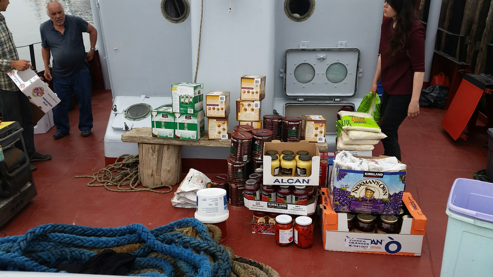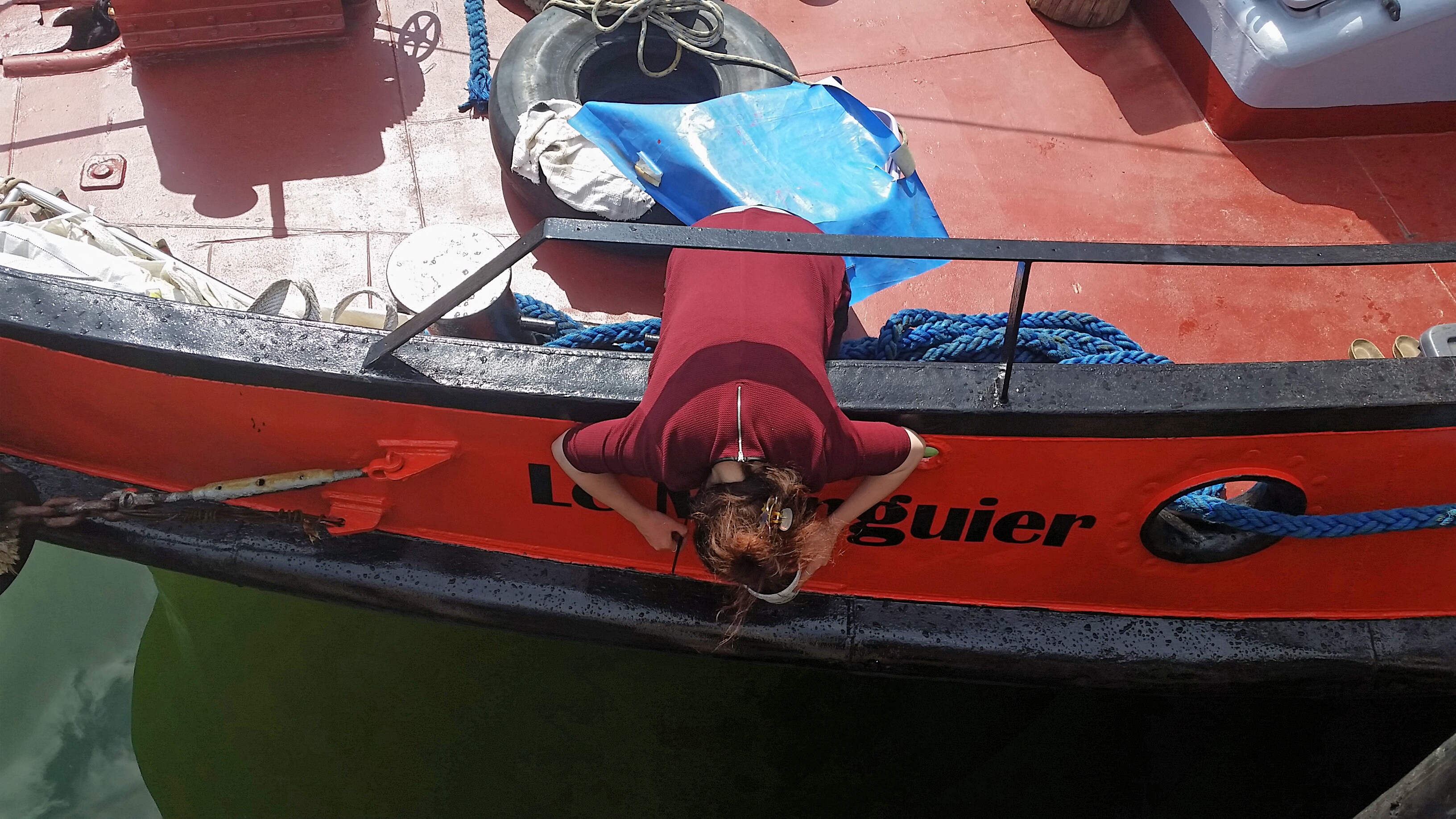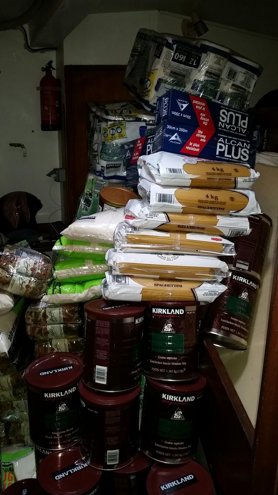 Depuis la mise à l’eau du Manguier lundi, les derniers préparatifs avant le départ vont bon train. Le Manguier a retrouvé son nom à l’avant (disparu dans la tourmente du sablage en mai dernier), le nouveau poêle à bois dans la cabine arrière est installé, toutes les cheminées sur le pont avant et le pont supérieur ont été refaites, le plein de gasoil est fait, les 500 kgs de vivres sont réparties dans tous les coffres et armoires disponibles et la chambre froide regorge de produits frais. On pourra tenir un an.