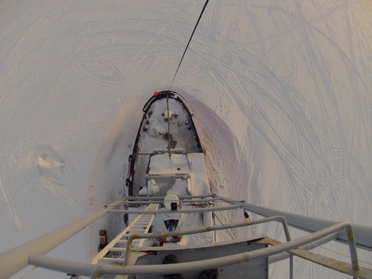 Antoine a fait un plouf hier en passant au dessus de la sortie du générateur … La glace a cassé, et il s’est retrouvé à l’eau ! Et vite sorti ! L’appareil photo aussi, mais il remarche … Ça ne l’a pas découragé, un peu plus tard il était en haut du mât. Cette image n’est pas de lui, mais de Julien, car j’ai oublié ma clef USB à bord ce matin en partant,
