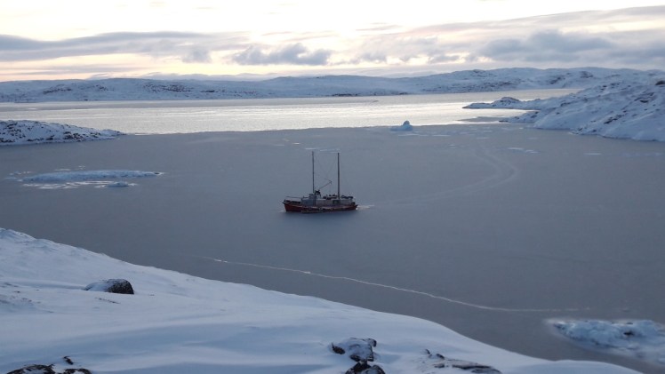 C’était pas prévu au programme, donc c’est normal ! Depuis hier (et même avant hier), gros coup d’ouest, avec tempête de neige depuis la nuit dernière. Donc impossible d’aller à Aasiaat pour récupérer les nouveaux arrivants ! Heureusement, Ejnar est à l’aéroport, avec le plan B en poche: accueillir les artistes (et le scientifique !), les accompagner au Café 3 pour manger une soupe au caribou, puis les loger (3 chez lui) deux chez Rinna (sa fille). En attendant que le temps s’améliore … demain, immaqa …
