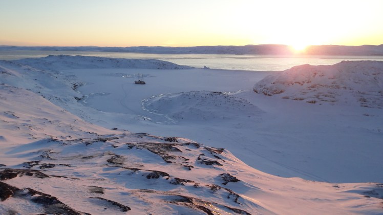 Message de Phil le Marin reçu cette nuit : la première équipe d’artistes est bien arrivée à Aasiaat et a pris la mer pour rejoindre le Manguier dans la baie d’Akunaaq. Le soleil est de la partie mais il fait quand même -20°C !