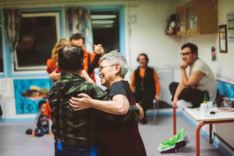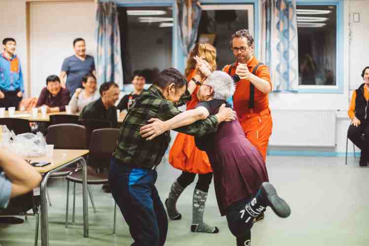 Présentations d’usage (qui nous sommes, pourquoi nous sommes ici), repas, puis tango Oïjha/Arnaud, accompagné de Ilit/Pitaraq (faisant les pitres), puis autres danses à deux, dirigées par Oïjha, couples franco/groenlandais, chants (l’hymne d’Akunnaaq entre autre et l’histoire d’un merle que l’on mange par petits bouts – A merula !-), concours de rapidité pour manger les amassat, (Aurélie a battu l’oncle de Jens Pitaa, pourtant très entraîné ! Mais Aurélie a horreur de perdre nous a-t-elle dit la bouche encore pleine !)