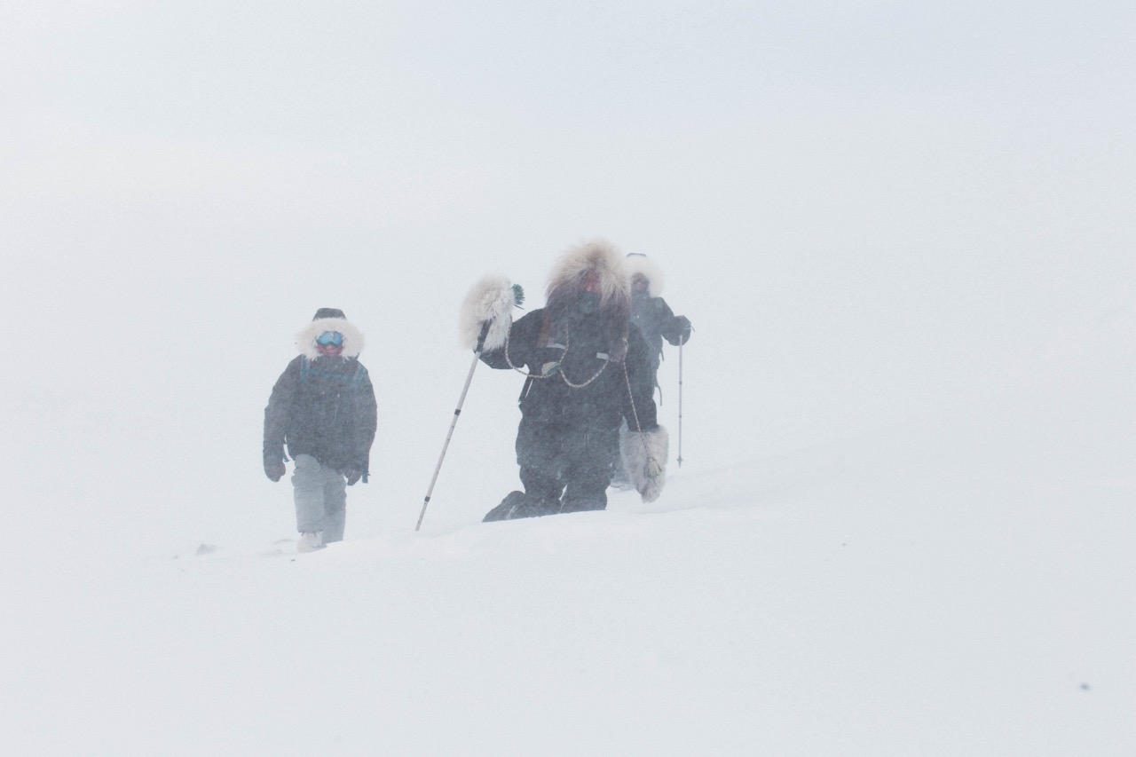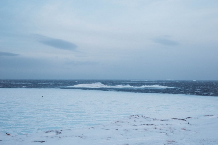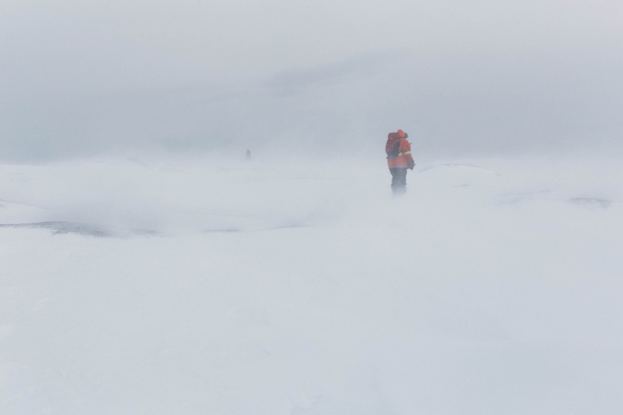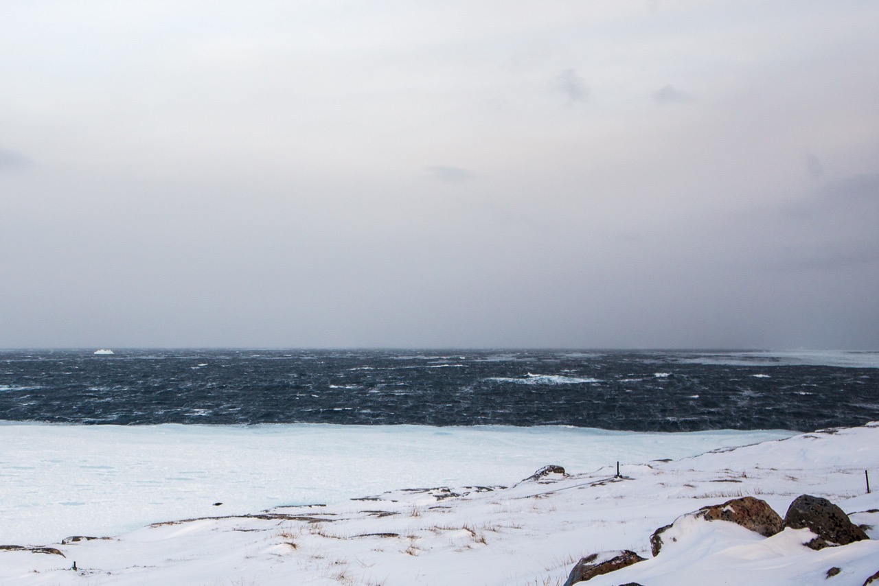 Avec cette tempête, le programme est bouleversé, mais nous n’arrivons pas à tenir en place, et une équipe d’expédition se met en place pour rejoindre Akunnaaq en début d’après midi. Vent violent, bourrasques de neige, tout y est pour vraiment se croire (enfin !) au Groenland. Le spectacle à l’arrivée à Aku est grandiose: la mer est déchaînée, explose en gerbes de glace en se heurtant aux îles au large d’Aku et la houle fait danser la glace encore fragile de la baie. Douches, blog, courses et c’est déjà le retour, plus facile, vent dans le dos.