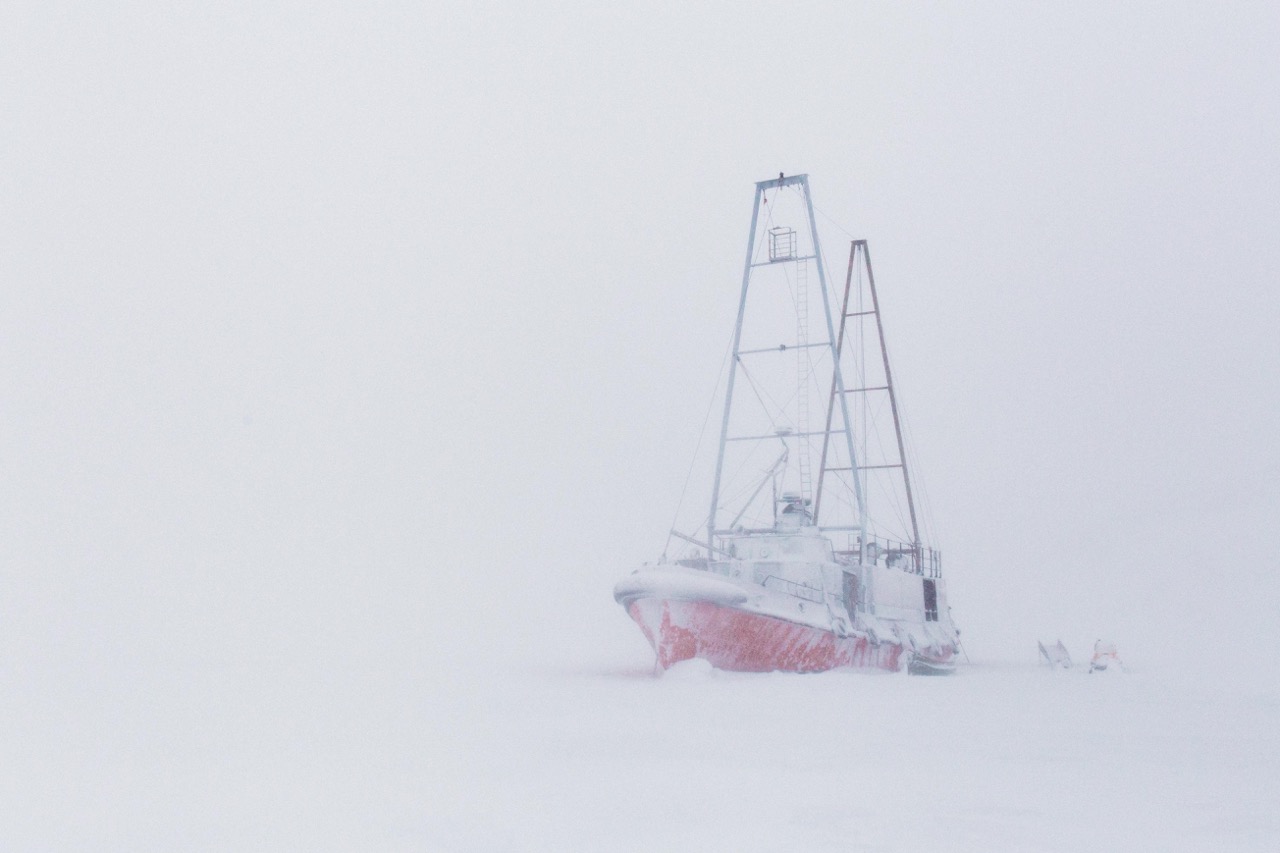 Le temps change à une vitesse stupéfiante en Arctique, c’est bien connu. Hier journée superbe, le soir ciel constellé d’étoiles, clin d’œil d’une aurore boréale en début de nuit, et à 3h du mat, soudain le vent qui rentre et qui monte. Premier battement, premier ronflement. Puis c’est au tour des mâts d’entonner leur mélopée.