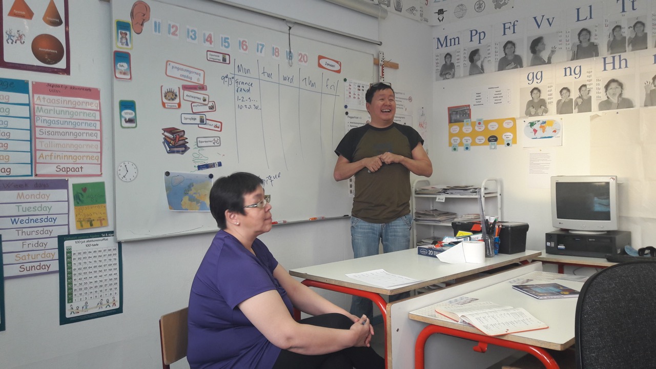 La semaine dernière, au cours d’une très officielle réunion à l’école, il a été décidé que l’équipe des artistes animerait toute la semaine la classe à l’école. Au programme, un peu d’enseignement du français (c’est merveilleux de voir que dans un petit village aussi reculé qu’Akunnaaq, il y a un vrai souhait d’entendre et d’apprendre le français), une présentation de l’endroit où l’on vit, comment est organisé l’école en France, quel genre de nourriture est la notre et ce que nous mangeons.