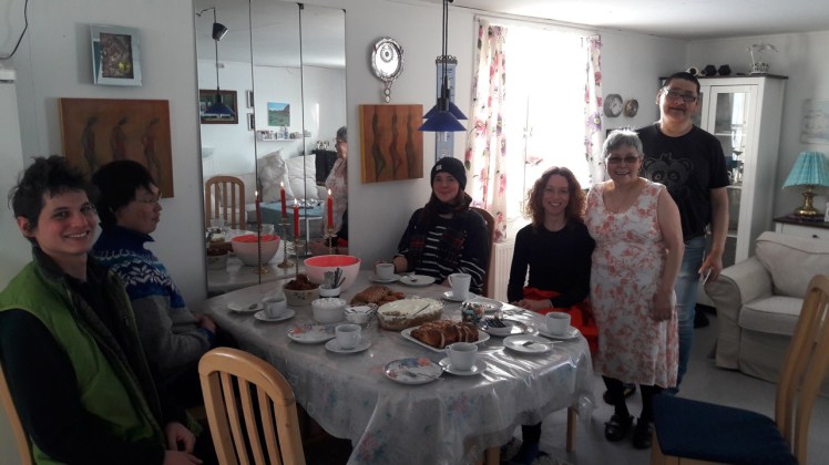 En attendant (avec impatience !) la nouvelle équipe, nous rebondissons de mondanités en mondanités: d’abord l’anniversaire d’Iiliit il y a quelques jours. Iiliit, c’est ma préférée à Akunnaaq ! Elle n’hésite absolument pas à te parler groenlandais, comme si tu l’avais toujours su. Et quand elle te voit mal à l’aise essayant de lui expliquer que tu ne comprends pas (paasingilara !), elle part d’un immense fou rire qui font pétiller un peu plus ses yeux déjà rieurs ! Iiliit, c’est la fée du logis. Grâce à elle, l’école est impeccable, je l’ai même vu nettoyer le derrière des tuyaux de chauffage central, ceux qui sont collés au mur ! Et toujours le sourire, ou plus souvent le rire !